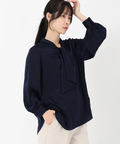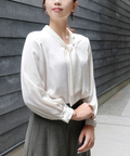 艶やかな光沢感と、しなやかな落ち感が美しいサテン素材を使用したボウタイブラウス。
