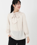 ほんのりとした光沢感が美しく、さらりとした肌触りが特徴のフリルリボンブラウス。