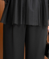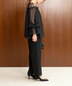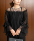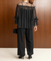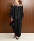 パンツスタイルでも、お袖のフリルデザインとデコルテのほどよい透け感が女性らしい印象に◎