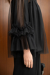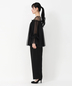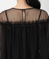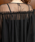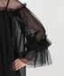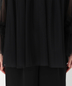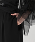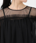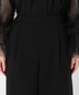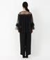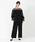 胸元と袖口のフリルがアクセントのチュールブラウスにワイドパンツがセットになったパンツドレス。