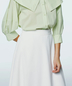 広がりすぎない絶妙な「ソフトフレアー」シルエットは、腰回りをすっきりと見せ、