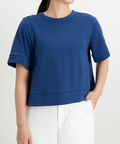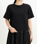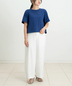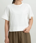 袖口や裾の切り替えデザインが全体を引き締め、ラフになりすぎない大人の「きれいめTシャツ」に仕上げました。