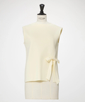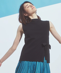 サイドに深く入ったスリットと、そこに添えられた立体的なリボンモチーフが、シンプルなノースリーブニットにドラマティックなアクセントをプラス。