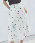 ドットと花柄を掛け合わせた、遊び心あふれるフラワープリントのフレアースカートです。