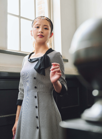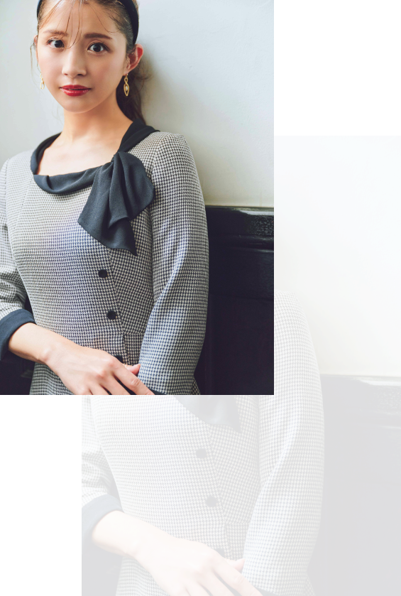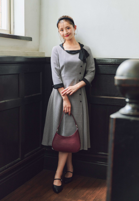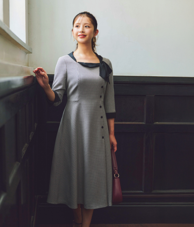 ストロベリーフィールズが得意とする王道の美シルエットに、クラシカルな千鳥柄をのせて、秋らしい装いに。デコルテを美しく引き立てるリボンと、袖口の折り返しが、ロイヤルムードを一層高めてくれます。