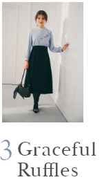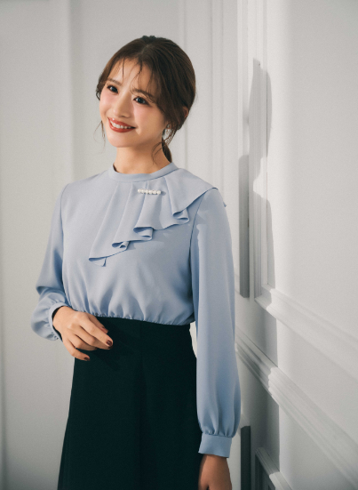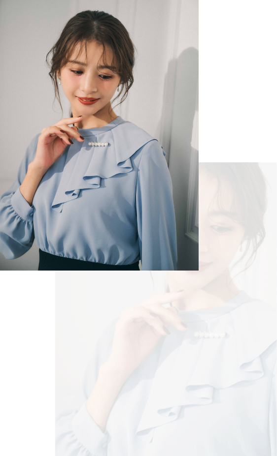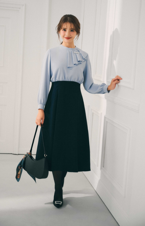 きちんと感が求められるシーンに指名したい、知性あふれるロイヤルドレス。アシンメトリーにあしらわれた襟元のラッフルフリルが、顔まわりに華やかなリズムを添えてくれます。まるでブラウスとスカートをセットアップで着ているかのような、ドッキングデザインが持ち味です。トップスは軽やかなブラウス素材、スカートはストレッチの効いたダブルクロス素材を使用。手間いらずのマシンウォッシャブル対応でお手入れもスマートに♡