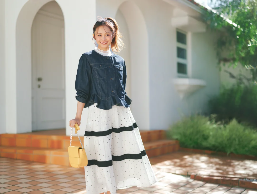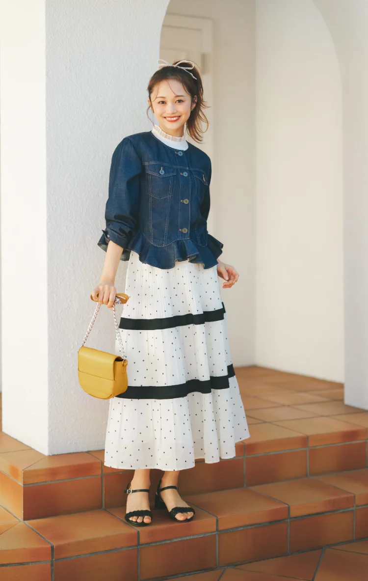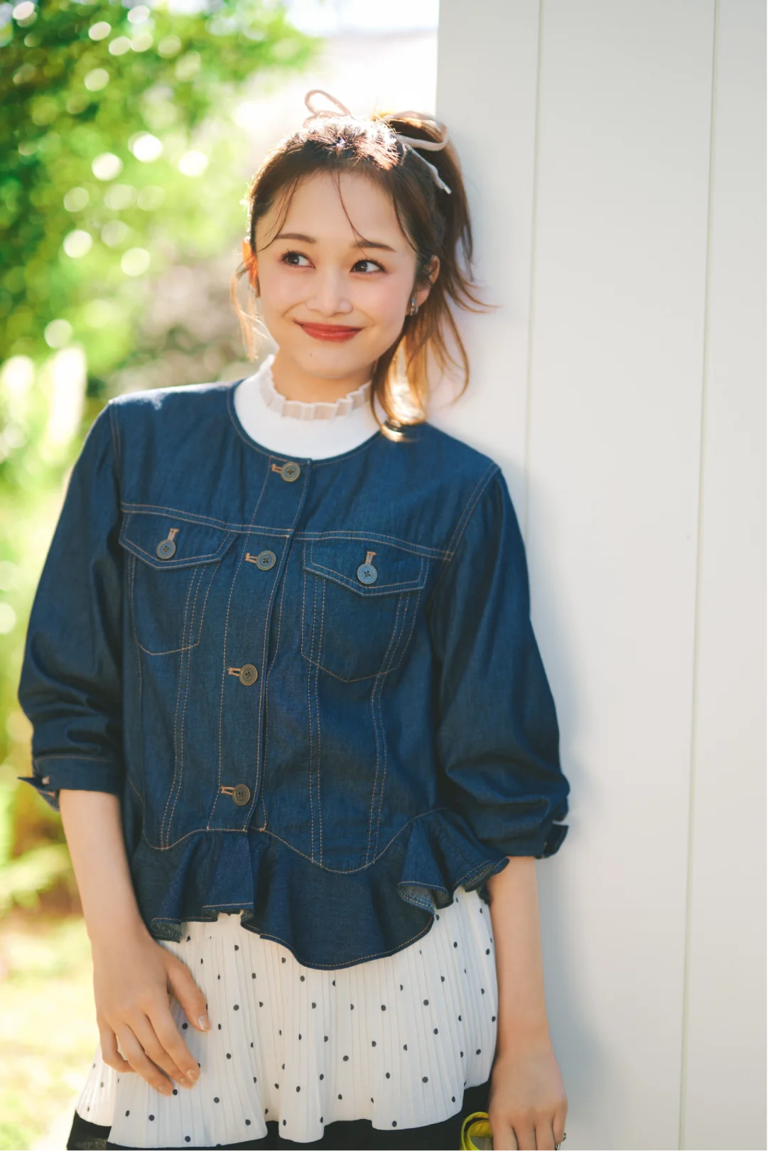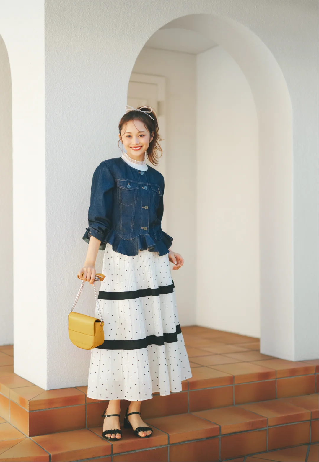 ほんのり甘口なデニムジャケットで春の装いを更新! シャツのように軽くて柔らかいライトオンスデニムを使用したノーカラージャケットは、裾のラッフルが可愛げポイント。さっと羽織るだけで着こなしが決まる、頼れるプラスワンアイテムです。合わせたのは、オリジナルドットをプリントしたティアードスカート。異なるプリーツをミックスすることで、動きのある表情が生まれ、着映え感も抜群。後ろウエストはゴム仕様で着心地の良さもマークと、いいことずくめです。