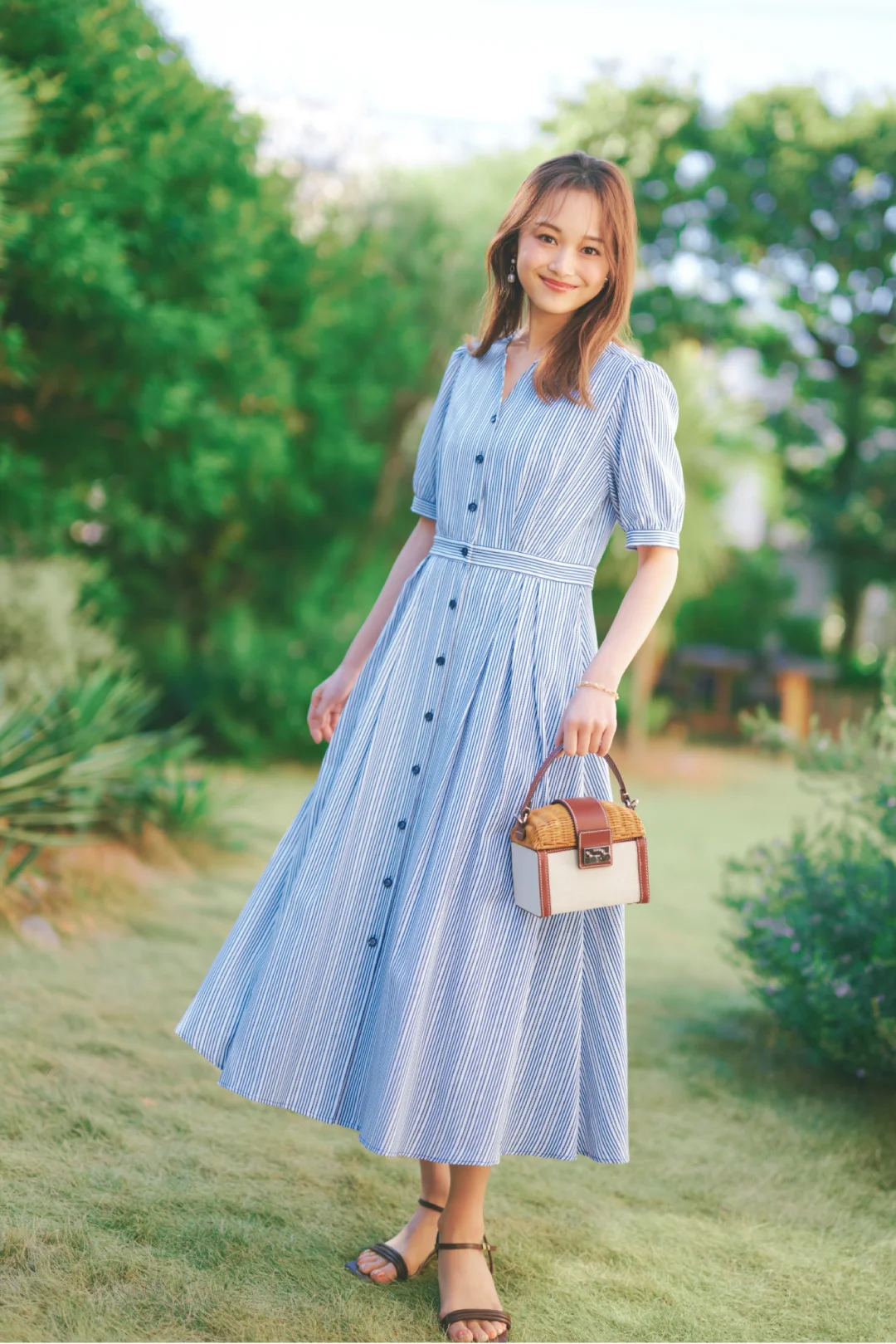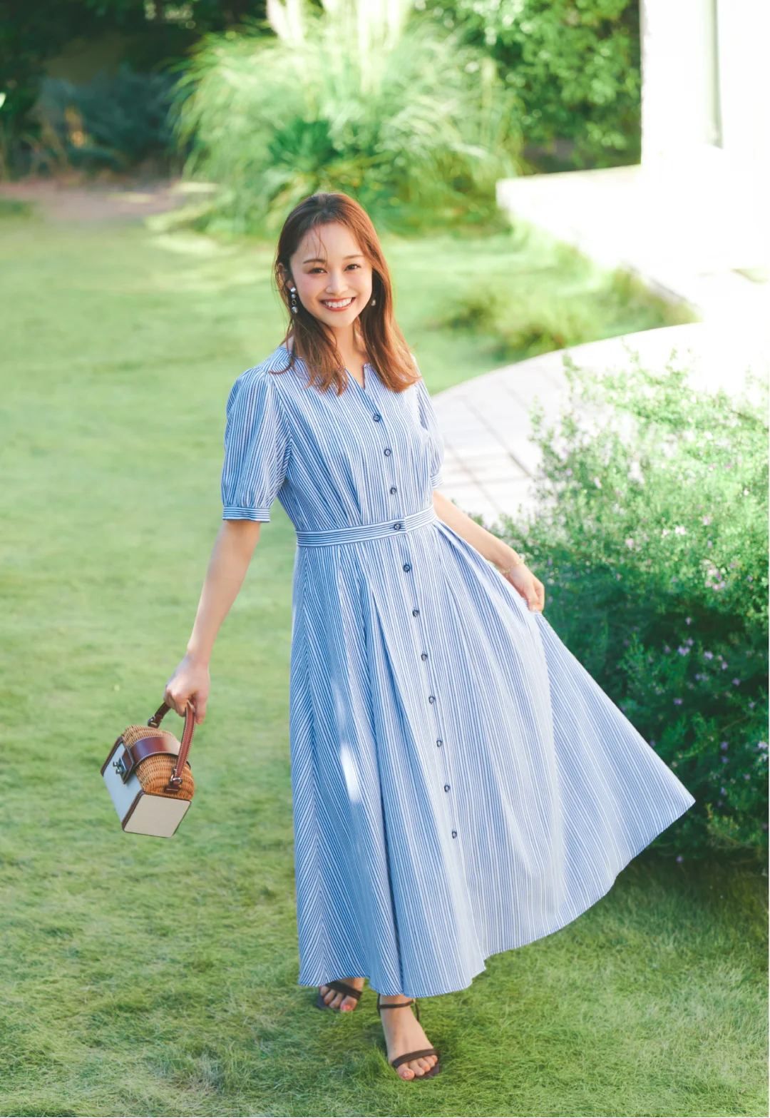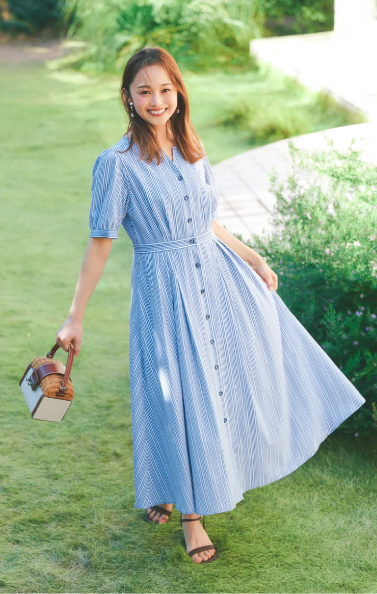 この春は、着るだけでよそゆき顔になれるシャツワンピースに注目。リボンを織り込んだような繊細なストライプが、ときめきを運んでくれます。華奢なアクセサリーが映えるキーネックに、スタイルアップを計算したフィット&フレアシルエット。グラデーションカラーのボタンやふんわりパフスリーブなど、細部にまでこだわりが満載! マシンウォッシャブル対応で、汗ばむ日でも気軽にデイリー使いでき、どんなシーンでも気分が上がる一枚です♡