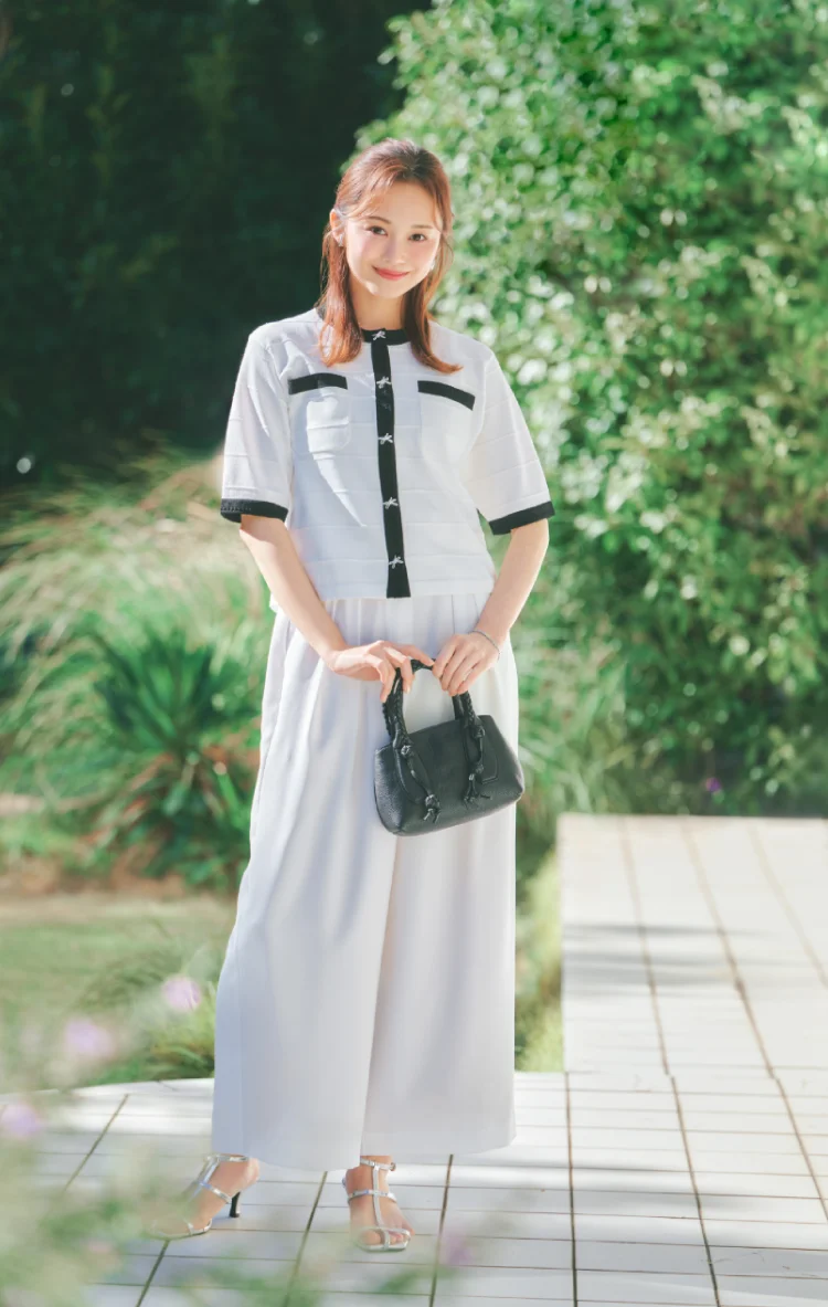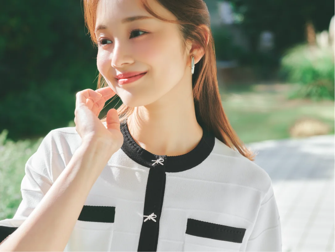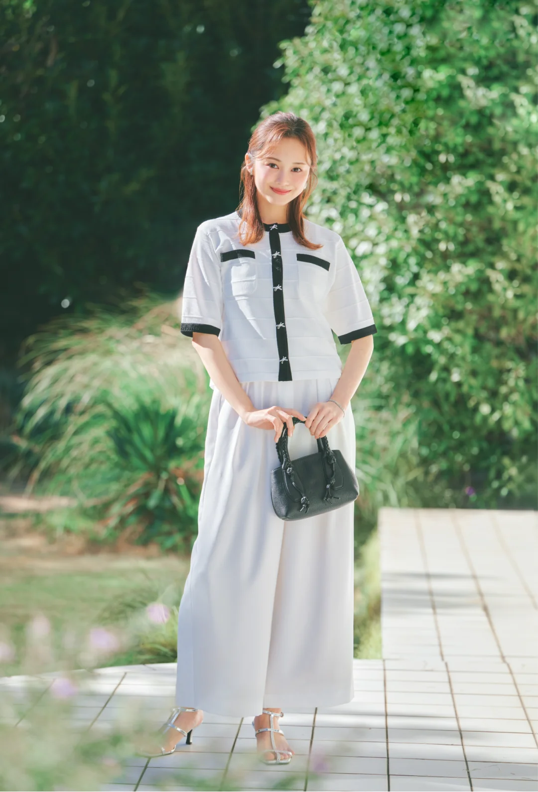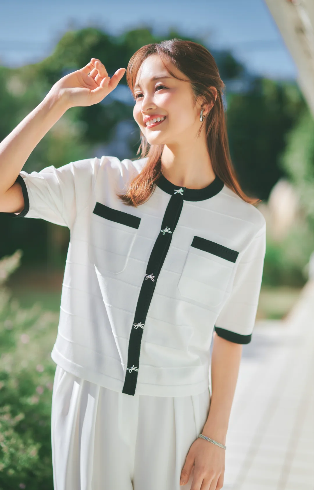 大人可愛い編み地と、日差しをうけてきらめくメタルリボンボタンで、いつものカーディガンコーデをアップデート! コンパクトな着丈と5分袖、程よくゆとりのある身頃で、きれいめにもカジュアルにも自在に着こなせます。カラーは、舞空さん着用のオフ×ブラックのほか、着こなしを引き締めるブラック×オフ、チアフルなブラッドオレンジの3色展開。ボトムは、防シワ・UVカット・接触冷感対応のホワイトパンツをあわせて、クリーンに仕上げて。
